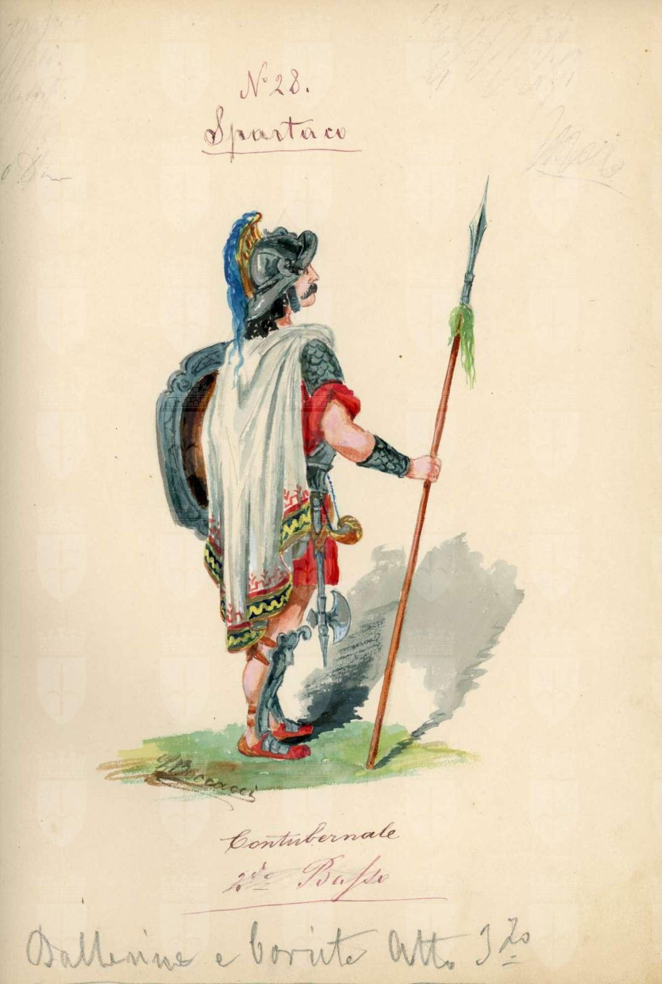 Spartaco, opera di Giuseppe Sinico. Figurino per il personaggio Contubernale. Figura maschile intera, girata di schiena di 3/4, in abbigliamento militare. Corta tunica rossa, corazza a squame, sandali e schinieri; lancia appoggiata a terra nella mano destra, scudi nella sinistra.