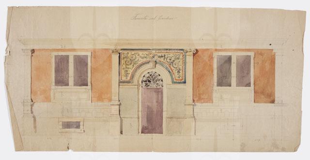 Si tratta di un progetto per il livello inferiore di una facciata su giardino con decorazione policroma a girali da immaginarsi eseguita ad affresco.