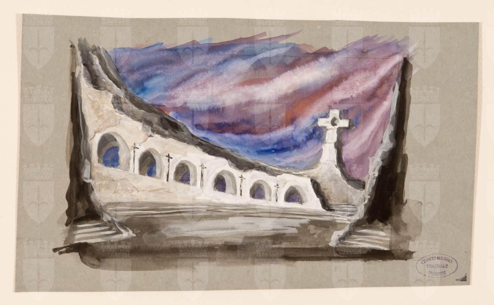 Suor Angelica, atto unico di Giacomo Puccini. Chiostro conventuale semicircolare con due piani separati da gradini. A destra e sinistra pareti rocciose, verso il fondo portico a doppio ordine di fori e vista su architettura con grande croce latina