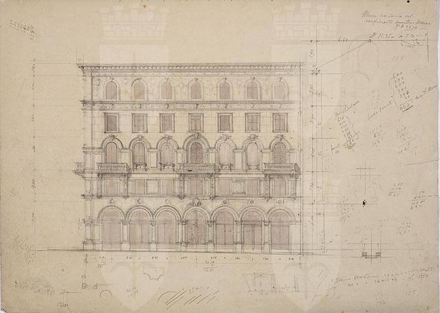 Il disegno fa parte della serie grafica eseguita da Ruggero Berlam per il progetto di una casa di sua proprietà sita in via Giulia 5 - angolo via Piccolomini, Trieste (schede CMSAOAR10_4233 - CMSAOAR10_4239). Si tratta di un edificio d’abitazione, che egli eseguì per profitto, in cui ritorna al linguaggio architettonico rinascimentale, che unisce al recupero del basamento a loggiato di Palazzo Ducale. Inizialmente egli aveva ipotizzato, come si può vedere nell'opera in esame, un partito decorativo ben più ricco, di quello effettivamente realizzato, espresso, in altri studi, anche nella ricerca coloristica giustapponendo parti a bugnato ad altre in muratura (cfr. CMSAOAR10_4235). Tuttavia nelle linee generali il palazzo edificato, considerato dalla critica “la miglior casa per appartamenti e una delle più belle costruite a Trieste alla fine del secolo decimonono” (Pozzetto 1999, p. 110), non si distanzia molto dai progetti grafici. Nel disegno in esame, il palazzo presenta, al pianoterra, una sfilata di arconi sorreggenti una teoria di oculi circolari, staccati dal mezzanino da una cornice poco evidenziata. Questo livello presenta finestre architravate, alternate da campi decorati a candelabra. Segue, staccato da un’importante fascia, il piano nobile con finestre e portefinestre (tre i balconi) marcate da paraste ornate nella ghiera e nell'archivolto. Al livello successivo, aperture rettangolari sono separate da una larga cornice marcapiano dalle finestre ad arco a tutto sesto con ghiera listellata dell’ultimo livello, alternate a tondi con nastri e decori da immaginare ad affresco o stucco, sopra le quali si imposta un importante cornicione rinascimentale.