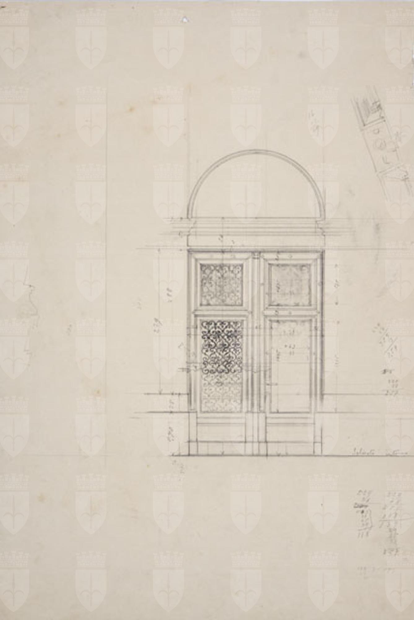 Studio quotato per un portone d'ingresso di un edificio, con quattro riquadri, due dei quali con grata. A destra del foglio, calcoli matematici e schizzo di dettaglio architettonico.