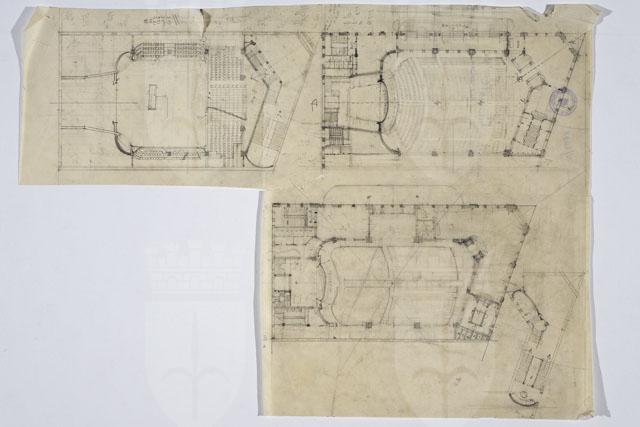 La tavola contiene tre planimetrie relative a diversi livelli di un cine-teatro parzialmente quotate. Calcoli matematici lungo il margine superiore.