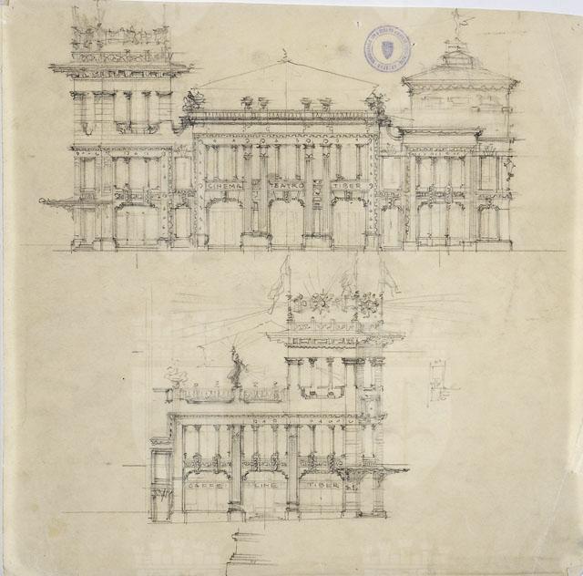Si tratta di uno dei quattro disegni preparatori appartenenti al progetto architettonico presentato al concorso per il cine-teatro Nazionale da erigersi all'angolo della via Rossetti con il viale XX Settembre, a Trieste, svoltosi nel 1919, con cui Arduino Berlam si aggiudicò il secondo premio, mentre il primo fu conferito all'ing. Allasia (Lettis 1996, p. 208). Il disegno illustra la facciata principale prospiciente su via Rossetti e quella laterale affacciata sul viale XX Settembre (già dell'Acquedotto), dove Berlam aveva previsto un caffé.