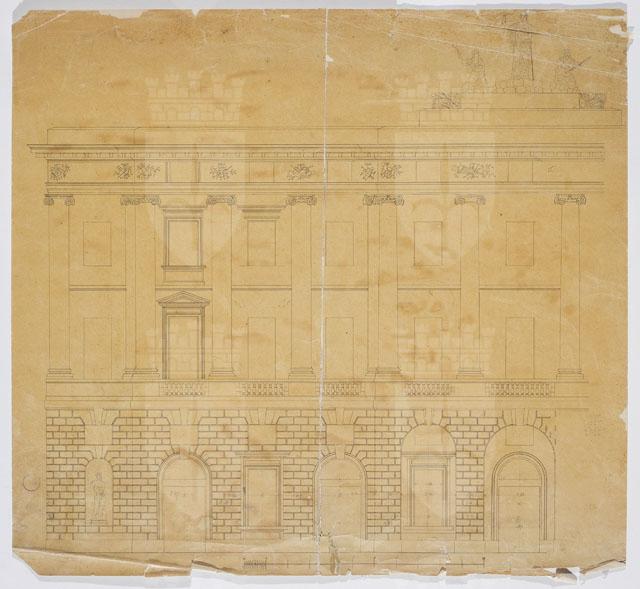 Secondo Pavan, il disegno, che rappresenta la metà sinistra del prospetto principale del Teatro Verdi in scala 1:50, può essere attribuito all'ing. Eugenio Geringer, che fin dal 1882 si era occupato di un restauro dell'edificio. "L'identica modellazione dei capitelli ionici, la corrispondenza delle misure con la facciata verso il mare [...] fanno pensare che il rilievo sia stato utilizzato per la progettazione di quel prospetto e quindi eseguito con questo preciso scopo" (Pavan 1988, pp. 80-81). Nel disegno è tratteggiata anche la decorazione scultorea dell'edificio: l'Apollo citaredo affiancato da due muse, le metope con strumenti musicali e la scultura di Plutone nella nicchia del basamento a sinistra.