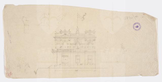 La tavola contiene il prospetto laterale, quotato, di una palazzina con due livelli sopra il suolo e due schizzi di dettagli architettonici.