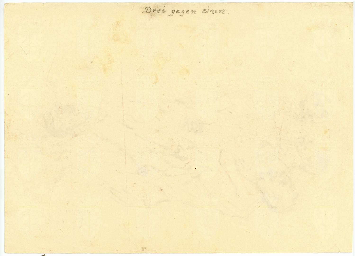 Sul recto: firma, luogo e data: Mušič Dachau 1945 Sul verso: nota manoscritta a matita “Drei gegen einen” (Tre contro uno)