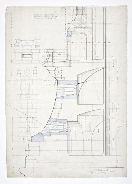 Si tratta di uno dei disegni progettuali del Faro della Vittoria, eseguiti da Arduino Berlam, che li donò ai Civici Musei di Storia ed Arte nel 1935, cfr. le schede da CMSAOAR06_3599 a CMSAOAR06_3634. In particolare, la tavola, già pubblicata nel 1919, sulle pagine de "L’architettura italiana", descrive nel dettaglio parte della base su cui si sarebbe impostato il fusto del faro. Proprio a partire da quell’anno, Arduino Berlam lavorò alla progettazione del Faro della Vittoria, architettura celebrativa e simbolica, che rispondeva al desiderio di esaltazione della patria e dell’italianità di Trieste redenta, sorto dopo la Grande Guerra, e alla necessità di onorare i suoi caduti. Già durante il conflitto, Berlam aveva ipotizzato di erigere un faro in onore di Nazario Sauro, eroe del mare, sulla punta istriana di Salvore, a poca distanza da Capodistria (cfr. CMSAOAR06_3631). Tuttavia questa prima idea fu modificata a guerra conclusa, quando la Lega navale propose di costruire il faro a Trieste, per sostituire l’obsoleta lanterna di Pietro Nobile. Dal giugno 1919, quando il progetto di massima venne approvato dal Consiglio Superiore dei Lavori Pubblici a Roma, al 1927, quando il faro fu inaugurato, il suo iter costruttivo fu tormentato da problemi e ritardi causati da divergenze di ordine tecnico-artistico e dall’antagonismo contro Arduino Berlam. Edificato sulle fondamenta del forte austriaco Kressich, costruito sul colle di Gretta nel 1854, su progetto dell'architetto Karl Möring, il faro presenta una gradinata monumentale alla cui sommità si trova un solettone. Su di esso è posta la lapide con l'epigrafe dedicatoria «A. D. MCMXXVII / SPLENDI E RICORDA / I CADUTI SUL MARE / MCMXV – MCMXVIII». Il manufatto prosegue con uno zoccolo a campana da cui pende l'àncora del caccia-torpediniere Audace, che il 3 novembre 1918 attraccò sul molo triestino ad esso intitolato. Sull'avancorpo del ballatoio, da cui si innalza il fusto della colonna, poggia la statua del Marinaio ignoto, eseguita da Giovanni Mayer. La colonna, in cemento armato, è rivestita da blocchi di pietra di Orsera e termina con un capitello che sorregge il terrazzo su cui poggia la lanterna. Quest'ultima è circondata da un ulteriore ballatoio in ferro ed è coronata da una cupola di rame a squame, su cui svetta una Vittoria alata, opera anch'essa di Mayer, forgiata da Giacomo Sreboth.