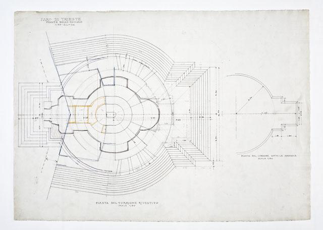 Si tratta di uno dei disegni progettuali del Faro della Vittoria, eseguiti da Arduino Berlam, che li donò ai Civici Musei di Storia ed Arte nel 1935, cfr. le schede da CMSAOAR06_3598 a CMSAOAR06_3634. In particolare, la tavola descrive le planimetrie dello zoccolo a campana, ossia del torrione rotondo rivestito e del cordone sotto le mensole. A partire dal 1919, Arduino Berlam lavorò alla progettazione del Faro della Vittoria, architettura celebrativa e simbolica, che rispondeva al desiderio di esaltazione della patria e dell’italianità di Trieste redenta, sorto dopo la Grande Guerra, e alla necessità di onorare i suoi caduti. Già durante il conflitto, Berlam aveva ipotizzato di erigere un faro in onore di Nazario Sauro, eroe del mare, sulla punta istriana di Salvore, a poca distanza da Capodistria (cfr. CMSAOAR06_3631). Tuttavia questa prima idea fu modificata a guerra conclusa, quando la Lega navale propose di costruire il faro a Trieste, per sostituire l’obsoleta lanterna di Pietro Nobile. Dal giugno 1919, quando il progetto di massima venne approvato dal Consiglio Superiore dei Lavori Pubblici a Roma, al 1927, quando il faro fu inaugurato, il suo iter costruttivo fu tormentato da problemi e ritardi causati da divergenze di ordine tecnico-artistico e dall’antagonismo contro Arduino Berlam. Edificato sulle fondamenta del forte austriaco Kressich, costruito sul colle di Gretta nel 1854, su progetto dell'architetto Karl Möring, il faro presenta una gradinata monumentale alla cui sommità si trova un solettone. Su di esso è posta la lapide con l'epigrafe dedicatoria «A. D. MCMXXVII / SPLENDI E RICORDA / I CADUTI SUL MARE / MCMXV – MCMXVIII». Il manufatto prosegue con uno zoccolo a campana da cui pende l'àncora del caccia-torpediniere Audace, che il 3 novembre 1918 attraccò sul molo triestino ad esso intitolato. Sull'avancorpo del ballatoio, da cui si innalza il fusto della colonna, poggia la statua del Marinaio ignoto, eseguita da Giovanni Mayer. La colonna, in cemento armato, è rivestita da blocchi di pietra di Orsera e termina con un capitello che sorregge il terrazzo su cui poggia la lanterna. Quest'ultima è circondata da un ulteriore ballatoio in ferro ed è coronata da una cupola di rame a squame, su cui svetta una Vittoria alata, opera anch'essa di Mayer e forgiata da Giacomo Sreboth.
