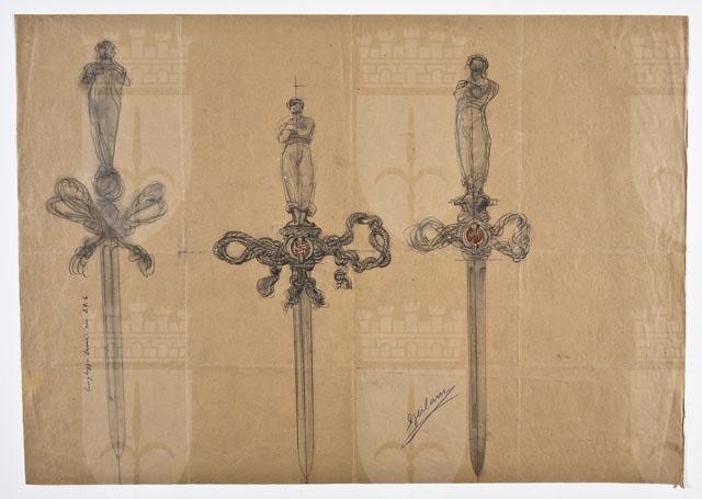 Il foglio contiene tre studi per uno spadino con elsa composta da gomene intrecciate, racchiudenti un comparto circolare con stemma della città di Trieste, e impugnatura a guisa di marinaio con le braccia conserte.