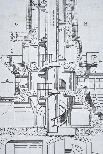 Entro linea di margine, disegno quotato raffigurante la sezione in alzato del Faro della Vittoria fino al secondo ballatoio con planimetrie relative a diverse altezze dello spaccato, indicate con lettere dell'alfabeto; alzato dello zoccolo a campana con accesso al Faro. Scala 1/100.