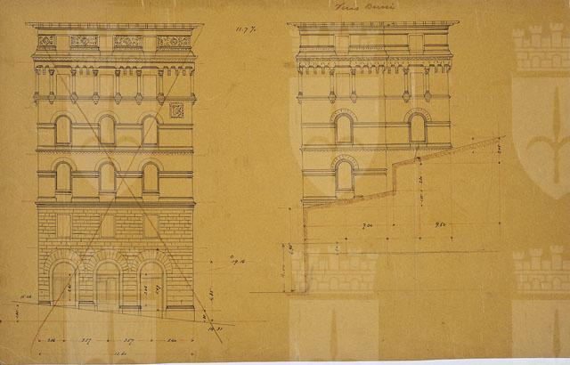 Tavola raffigurante i prospetti di due lati corti di edificio: quello a sinistra è quotato e barrato; quello a destra, presenta inoltre le misure dell'ingombro della costruzione contigua. Sul verso, rilievo topografico dell'area di via Benedetto Marcello e calcoli matematici.