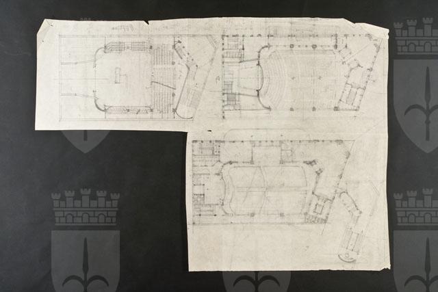 La tavola contiene tre planimetrie relative a diversi livelli di un cine-teatro parzialmente quotate. Calcoli matematici lungo il margine superiore.