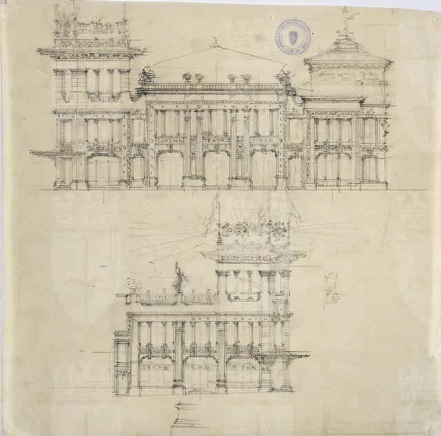 Si tratta di uno dei quattro disegni preparatori appartenenti al progetto architettonico presentato al concorso per il cine-teatro Nazionale da erigersi all'angolo della via Rossetti con il viale XX Settembre, a Trieste, svoltosi nel 1919, con cui Arduino Berlam si aggiudicò il secondo premio, mentre il primo fu conferito all'ing. Allasia (Lettis 1996, p. 208). Il disegno illustra la facciata principale prospiciente su via Rossetti e quella laterale affacciata sul viale XX Settembre (già dell'Acquedotto), dove Berlam aveva previsto un caffé.