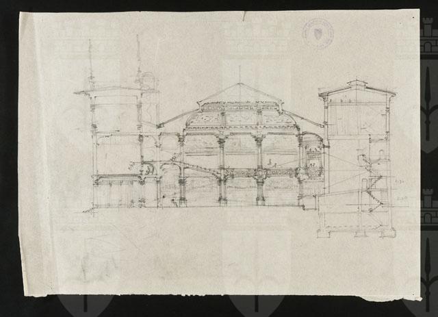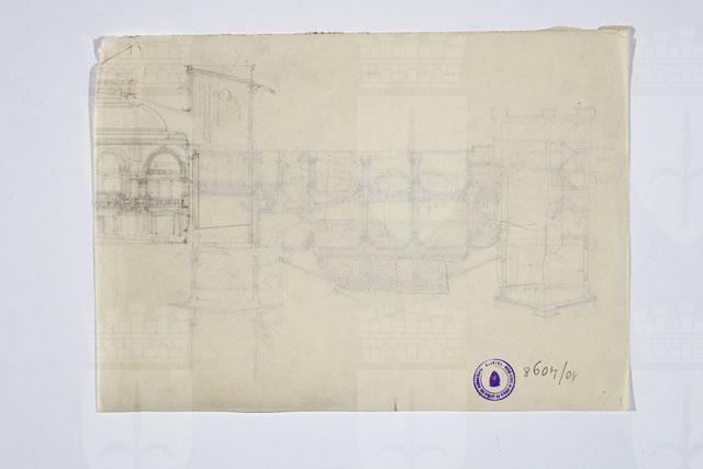 Disegno parzialmente quotato raffigurante spaccato di cine-teatro, sul recto; dettaglio dello stesso spaccato, sul verso.