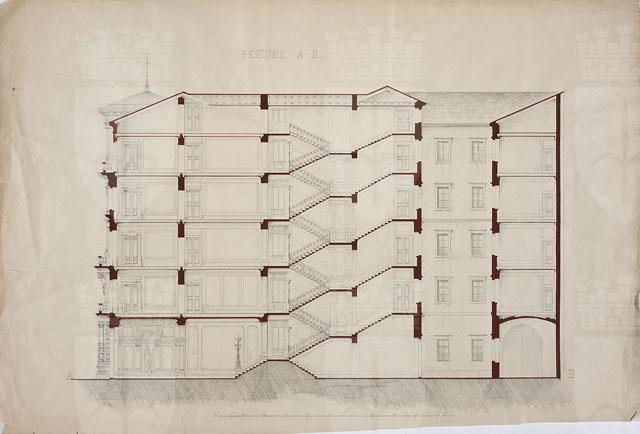 Sezione di un edificio a cinque livelli fuori terra. Scala grafica in tese viennesi.