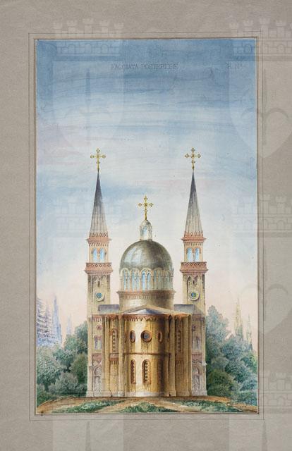 Entro passe-partout riquadrato, disegno ad acquerello, raffigurante prospetto posteriore di chiesa con due campanili laterali a base quadrata, in facciata; transetto sormontato da una cupola, impostata sul alto tamburo; cappelle laterali e abside.