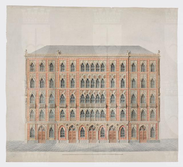 Il disegno in esame appartiene a una serie di tre studi acquarellati, due prospetti e una sezione, per un edificio in stile tardogotico veneziano (cfr. CMSAOAR10_4135- CMSAOAR10_4137). Come messo in luce dalla critica, si tratta con tutta probabilità di elaborati preliminari all’esecuzione di palazzo Gopcevic, realizzato da Giovanni Andrea Berlam nel 1850 su commissione di Spiridione Gopcevic, mercante di origini serbe, a Trieste. Palazzo Gopcevic si caratterizza infatti per lo stesso numero di livelli e di luci per piano e per il medesimo trattamento dell’intonaco di facciata, che, traendo ispirazione dall'architettura quattrocentesca veneziana, rompe con lo stile neoclassico dominante nell’edilizia triestina dell’epoca.