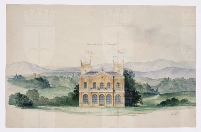 Disegno acquarellato raffigurante prospetto di villino entro un paesaggio. L'edificio, con due livelli sopra il suolo, è scandito da cinque grandi aperture ad arco al piano terreno ed altrettante, di dimensioni minori, al piano superiore, distinto dal primo, attraverso una balaustrata continua, che, nella parte centrale aggettante, si trasforma in balcone. La parte aggettante termina a guisa di frontone con oculo. Il fabbricato è concluso da un'alta cimasa. Sul retro, l'edificio è chiuso da due torri laterali.