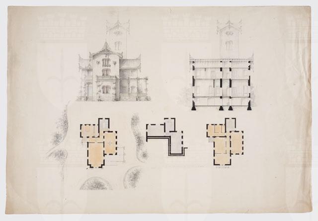 Si tratta di un progetto di villino, sviluppato anche in altre due tavole (cfr. CMSAOAR10_4141 e CMSAOAR10_4142), ove elementi di gusto Rundbogenstil sono accostati ecletticamente ad altri propri della casa rustica in legno. Acquistato per le civiche collezioni da Lituano Samero nel 1953, il disegno, sulla scorta di un'iscrizione vergata da mano ignota, è stato attribuito a Giovanni Andrea Berlam.
