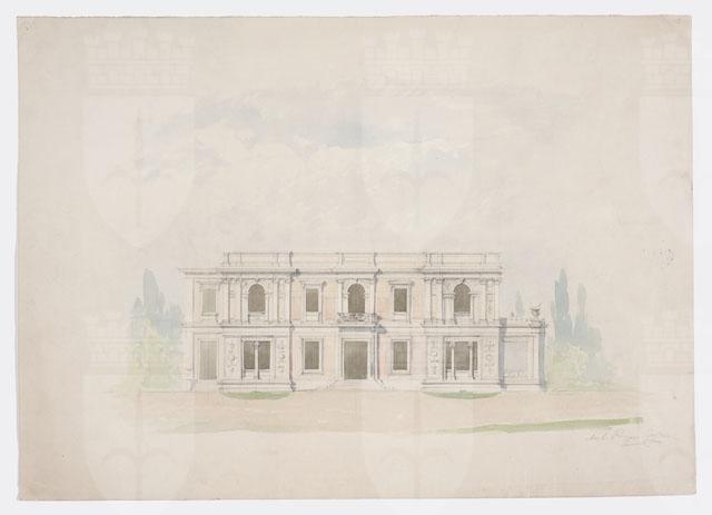 Disegno a matita e acquerello policromo, raffigurante prospetto di villino a due livelli.