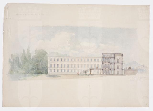 Disegno a matita e acquerello policromo, raffigurante la sezione trasversale di un ospedale entro parco. Grande terrazza al primo livello sul retro del corpo principale.