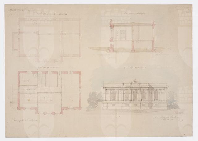 Tavola a matita e acquerello policromo, raffigurante un progetto per un villino a due livelli (piano semisotterraneo e piano elevato). Essa contiene le planimetrie dei due piani (in qualche locale è indicata con scritte la destinazione d'uso), la sezione trasversale e il prospetto della facciata principale.