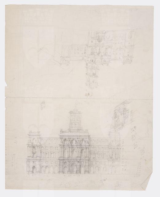 Schizzo a matita parzialmente quotato di un edificio a cinque livelli con corpi aggettanti, che lo definiscono lateramente, e al centro. Il piano terra e il mezzanino sono collegati da un partito murario a bugnato; un ordine gigante di colonne binate, sulla cui trabeazione vi sono gruppi scultorei, caratterizza i corpi sporgenti. L'avancorpo centrale presenta tre grandi finestre ad arco a tutto sesto; mentre il resto della facciata è traforato da finestre timpanate e architravate, rispettivamente al primo e secondo piano. L'ultimo piano, invece, presenta una doppia soluzione per le aperture: a tutto sesto, nella metà di sinistra dello schizzo, architravate, nella metà destra. In asse con l'avancorpo centrale, vi è una torretta con pennone per bandiera. Sul foglio, vi sono altri schizzi architettonici e calcoli matematici.