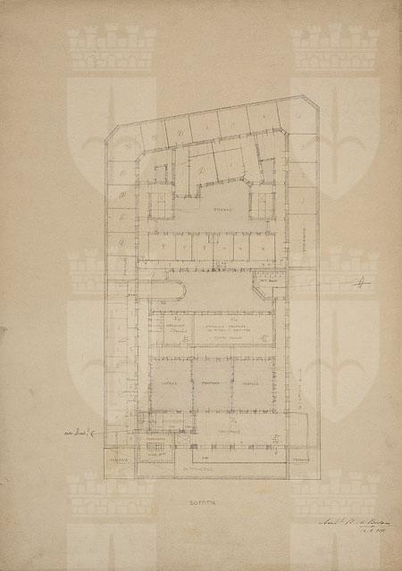 Planimetria della soffitta di un edificio a matita e acquerello, con sezione delle murature tratteggiate. La destinazione dei vani è indicata da iscrizioni. Le zone acquerellate di azzurro corrispondono ai cortili e alle terrazze.