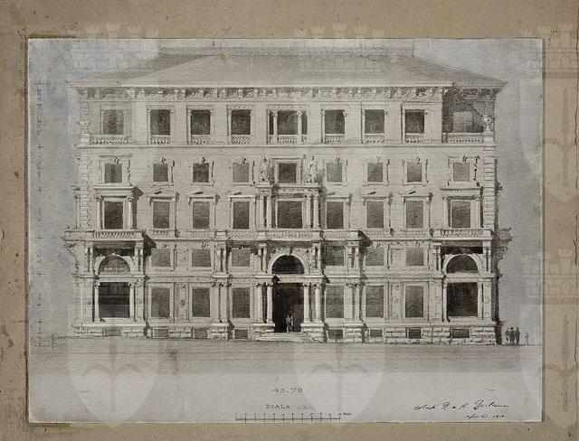 Il disegno in esame appartiene al "Progetto per l'edificio della Riunione Adriatica di Sicurtà", cfr. schede CMSAOAR10_4176-CMSAOAR10_4206. Agli inizi del Novecento il direttore generale della Riunione Adriatica di Sicurtà, Adolfo de Frigyessy, e suo figlio Arnoldo, decisero di realizzare una nuova sede di rappresentanza per la compagnia a Trieste. Acquistato un ampio lotto già edificato tra la piazza Nuova e le vie S. Caterina, S. Antonio e il Corso, e demolite le precedenti costruzioni, indissero nel luglio 1909 un concorso internazionale a inviti per la progettazione di un nuovo palazzo. Oltre a Ruggero e Arduino Berlam, vi parteciparono gli architetti Ignác Alpar, Ludwig Baumann, Max Littmann, Luigi Broggi, Giacomo Zamattio, Giorgio Zaninovich, Enrico Nordio e Ludovico Braidotti. Nel bando si richiedeva che il palazzo contenesse un semi-sotterraneo, un piano elevato, un ammezzato, tre piani superiori più un sottotetto; ma non si davano indicazioni sulla distribuzione interna degli ambienti e su requisiti tecnologici. Nel novembre 1909 la giuria selezionò, tra i progetti pervenuti, quelli di Alpar, Zammattio e dei Berlam (Lettis in Rovello 2007, p. 312) per la seconda fase del concorso. Tuttavia Zammattio e Alpar non si presentarono, cosicché lo studio Berlam, unico rimasto fra i selezionati, ricevette l’incarico. Seguì una fase in cui Ruggero e Arduino Berlam vennero costantemente seguiti dalla committenza nell’elaborazione dell’assetto generale e di ogni minuto dettaglio dell’edificio. La direzione della compagnia assicurativa voleva che lo stabile fosse destinato per metà a sede della società, cioè verso la Piazza Nuova (odierna Piazza della Repubblica); mentre il lato opposto, verso il Corso, fosse adibito a negozi, al pianterreno, e abitazioni. Anche il piano prospiciente la via S. Antonio (attuale via Dante) era riservato agli esercizi commerciali. Il progetto definitivo dei Berlam, datato 2 dicembre 1910, venne approvato dal Magistrato civico il 12 gennaio 1911; il permesso di fabbrica è del 28 giugno 1911. L’Impresa Carlo Bonetti costruì il palazzo, che fu inaugurato il 7 aprile 1914. Si tratta di un capolavoro del tardo eclettismo europeo, in cui si recuperano gli stilemi della tradizione architettonica del tardo Cinquecento. Nel palazzo, articolato in cinque piani, gli architetti si sono rifatti all’architettura “di facciata, ai palazzi italiani del secolo XVI” (Berlam cit. in Lettis in Rovello 2007, p. 313, nota 9). Quanto al disegno in esame, esso illustra una versione della facciata principale, che trova affinità anche con lo schizzo CMSAOAR10_4191 e con il disegno CMSAOAR10_4195; il disegno CMSAOAR10_4197 ne costituisce invece una copia. Secondo Ceiner, si tratta della seconda versione della facciata, proposta dai Berlam, datata 1910 (1995, p. 212). In esso, la fascia che lega il pianoterra e l’ammezzato è scandita da grandi aperture a tutto sesto alle estremità del prospetto, che ripetono l’arcata di accesso all’edificio, segnato da colonne. Al piano nobile, ritmato da finestre architravate e timpanate, l’asse centrale è segnato da colonne binate che sorreggono una trabeazione, sormontata da sculture. All’ultimo livello, terrazze d’angolo fiancheggiano il corpo dell’edificio traforato da aperture delimitate da balaustre; tetto a falde aggettanti. Altri studi per il prospetto principale alle schede CMSAOAR10_4192, CMSAOAR10_4194, CMSAOAR10_4196.