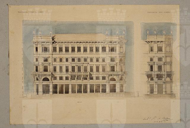 Disegno a matita, penna e acquerello, parzialmente quotato, raffigurante il prospetto della facciata verso il Corso e il dettaglio della testata verso il Corso.