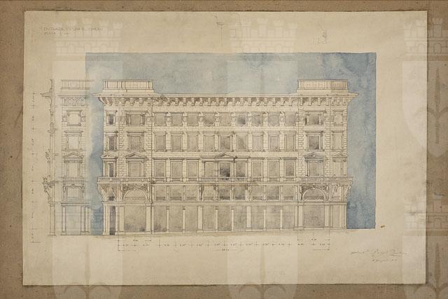 Il disegno in esame appartiene al "Progetto per l'edificio della Riunione Adriatica di Sicurtà", cfr. schede CMSAOAR10_4176-CMSAOAR10_4206. Agli inizi del Novecento il direttore generale della Riunione Adriatica di Sicurtà, Adolfo de Frigyessy, e suo figlio Arnoldo, decisero di realizzare una nuova sede di rappresentanza per la compagnia a Trieste. Acquistato un ampio lotto già edificato tra la piazza Nuova e le vie S. Caterina, S. Antonio e il Corso, e demolite le precedenti costruzioni, indissero nel luglio 1909 un concorso internazionale a inviti per la progettazione di un nuovo palazzo. Oltre a Ruggero e Arduino Berlam, vi parteciparono gli architetti Ignác Alpar, Ludwig Baumann, Max Littmann, Luigi Broggi, Giacomo Zamattio, Giorgio Zaninovich, Enrico Nordio e Ludovico Braidotti. Nel bando si richiedeva che il palazzo contenesse un semi-sotterraneo, un piano elevato, un ammezzato, tre piani superiori più un sottotetto; ma non si davano indicazioni sulla distribuzione interna degli ambienti e su requisiti tecnologici. Nel novembre 1909 la giuria selezionò, tra i progetti pervenuti, quelli di Alpar, Zammattio e dei Berlam (Lettis in Rovello 2007, p. 312) per la seconda fase del concorso. Tuttavia Zammattio e Alpar non si presentarono, cosicché lo studio Berlam, unico rimasto fra i selezionati, ricevette l’incarico. Seguì una fase in cui Ruggero e Arduino Berlam vennero costantemente seguiti dalla committenza nell’elaborazione dell’assetto generale e di ogni minuto dettaglio dell’edificio. La direzione della compagnia assicurativa voleva che lo stabile fosse destinato per metà a sede della società, cioè verso la Piazza Nuova (odierna Piazza della Repubblica); mentre il lato opposto, verso il Corso, fosse adibito a negozi, al pianterreno, e abitazioni. Anche il piano prospiciente la via S. Antonio (attuale via Dante) era riservato agli esercizi commerciali. Il progetto definitivo dei Berlam, datato 2 dicembre 1910, venne approvato dal Magistrato civico il 12 gennaio 1911; il permesso di fabbrica è del 28 giugno 1911. L’Impresa Carlo Bonetti costruì il palazzo, che fu inaugurato il 7 aprile 1914. Si tratta di un capolavoro del tardo eclettismo europeo, in cui si recuperano gli stilemi della tradizione architettonica del tardo Cinquecento. Nel palazzo, articolato in cinque piani, gli architetti si sono rifatti all’architettura “di facciata, ai palazzi italiani del secolo XVI” (Berlam cit. in Lettis in Rovello 2007, p. 313, nota 9). Quanto al disegno in esame, esso illustra la proposta pressoché definitiva della facciata sul Corso. Datato giugno 1910, il disegno mantiene la soluzione degli avancorpi, presente nei precedenti progetti CMSAOAR10_4198 e CMSAOAR10_4199, ma in continuità con gli altri tre lati dell’edificio, presenta finestre timpanate al primo piano nobile in corrispondenza dei due corpi aggettanti e dell’asse centrale. All’ultimo livello, le finestre sono inserite entro una fascia a rosoni. Un cornicione aggettante delimita il tetto, che in corrispondenza degli avancorpi presenta attici percorsi da lesene.