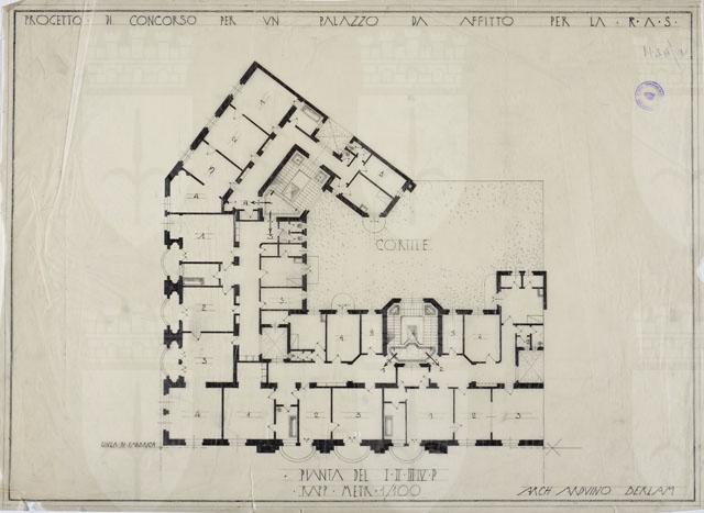 Disegno a matita e inchiostro su carta. Planimetria di un palazzo, pianta del I, II, III, IV piano. Scala 1:100. I vani sono numerati.