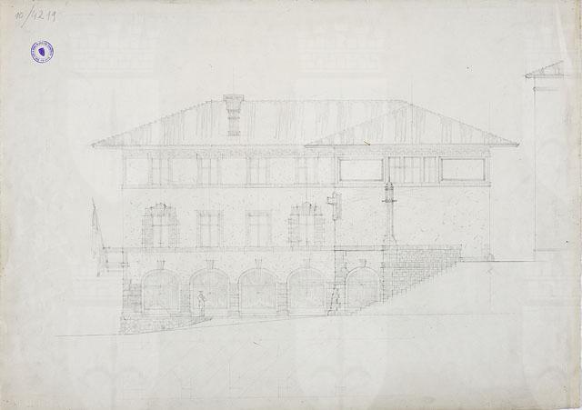 Disegno a matita; progetto per la facciata laterale di un edificio ad L, impostato su piano leggermente in pendenza. Consta di due piani elevati e di uno leggermente rialzato, che è definito da un portico con aperture ad arco.