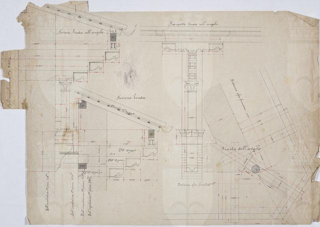 Il foglio contiene quattro disegni quotati raffiguranti: 1) sezione linda nell'angolo; 2) sezione linda; 3) prospetto linda nell'angolo; 4) pianta dell'angolo. Sono registrate anche le distanze dall'impalcatura, la distanza dall'asse delle finestre, il morale dell'orditura del tetto e il numero di pezzi di cui sono composti gli elementi descritti.