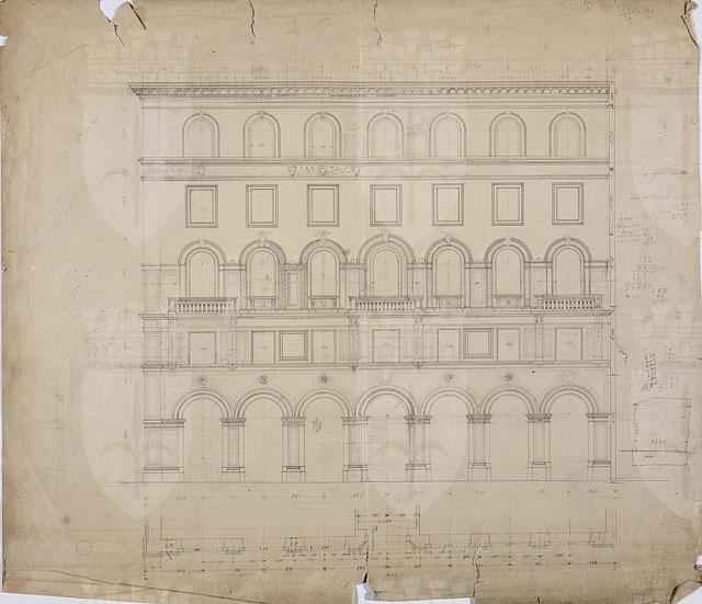 Il disegno fa parte della serie grafica eseguita da Ruggero Berlam per il progetto di una casa di sua proprietà sita in via Giulia 5 - angolo via Piccolomini, Trieste (schede CMSAOAR10_4233 - CMSAOAR10_4239). Si tratta di un edificio d’abitazione, che egli eseguì per profitto, in cui ritorna al linguaggio architettonico rinascimentale, che unisce al recupero del basamento a loggiato di Palazzo Ducale. Inizialmente egli aveva ipotizzato, come si può vedere negli studi grafici, un partito decorativo più ricco (anche cfr. CMSAOAR10_4234) di quello effettivamente realizzato, espresso anche nella ricerca coloristica nel giustapporre parti a bugnato ad altre in muratura (cfr. CMSAOAR10_4235). Tuttavia nelle linee generali il palazzo edificato, considerato dalla critica “la miglior casa per appartamenti e una delle più belle costruite a Trieste alla fine del secolo decimonono” (Pozzetto 1999, p. 110), non si distanzia molto dai progetti grafici. Nel disegno in esame, il palazzo presenta al pianoterra, una sfilata di arconi sorreggenti una teoria di oculi circolari, staccati dal mezzanino con una cornice poco evidenziata. Segue, staccato da un’importante fascia, il piano nobile con finestre e portefinestre (tre i balconi) marcate da paraste con decori a candelabra. Tale decorativismo non interessa le aperture rettangolari nel livello superiore, separate da una larga cornice marcapiano dalle finestre ad arco a tutto sesto con ghiera listellata dell’ultimo livello, sopra le quali si imposta un importante cornicione rinascimentale.
