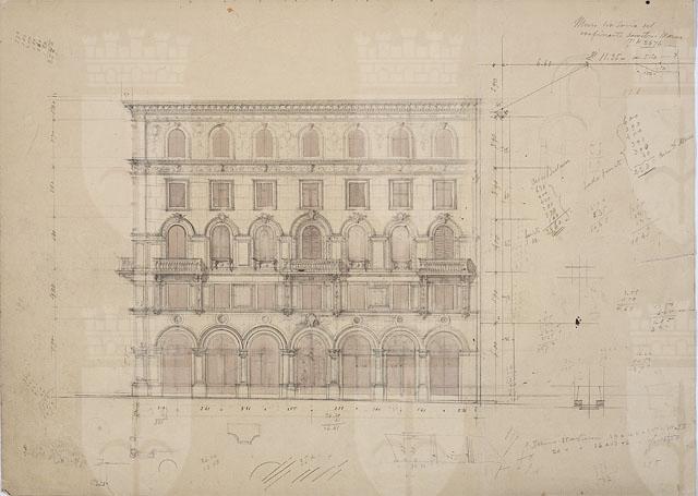 Disegno quotato a matita, penna e acquerello, raffigurante prospetto di edificio a cinque livelli. Tutt'attorno schizzi di dettagli architettonici e calcoli numerici. Sul verso, schizzo per una facciata.