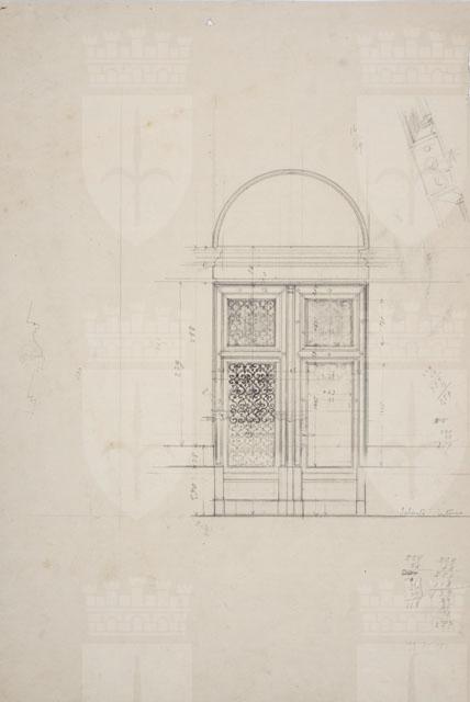 Studio quotato per un portone d'ingresso di un edificio, con quattro riquadri, due dei quali con grata. A destra del foglio, calcoli matematici e schizzo di dettaglio architettonico.