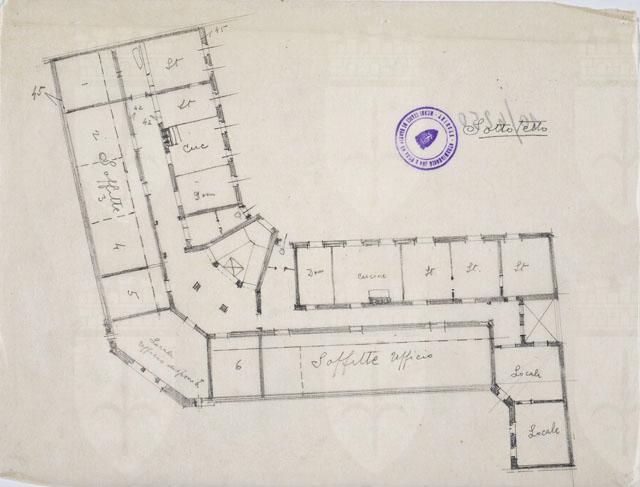 Disegno a matita raffigurante la planimetria del sottotetto di un edificio per l'Istituto Nazionale d'Assicurazione per gli Infortuni sul Lavoro. Studio della distribuzione dell'edificio con definizione della destinazione d'uso (scritte all'interno dei locali).