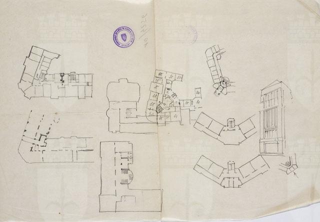 Disegno a matita su carta; contiene otto schizzi per planimetrie di un palazzo, uno per un ingresso e uno schizzo del prospetto. Una planimetria presenta scritte che indicano la destinazione d'uso degli ambienti.