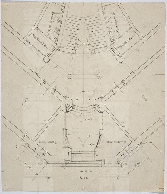 Si tratta di uno dei disegni della serie "Progetto per la costruzione della sede dell'Istituto Nazionale d'Assicurazione per gli Infortuni sul Lavoro in via Coroneo" eseguiti da Arduino Berlam, cfr. schede CMSAOAR10_4245 - CMSAOAR10_4271. Nel dicembre 1922 Arduino Berlam venne invitato a partecipare al concorso per la sede dell'Istituto Nazionale d'Assicurazione per gli Infortuni sul Lavoro, che sarebbe stata realizzata in via Coroneo a Trieste. Egli presentò la sua proposta il 14 marzo 1923, che non venne selezionata: fu preferito il progetto degli architetti Enrico e Umberto Nordio. Il foglio contiene la planimetria per l'angolo smussato dell'edificio, caratterizzato per l'accesso principale. Si veda anche il disegno CMSAOAR10_4257 e la tavola definitiva CMSAOAR10_4263.