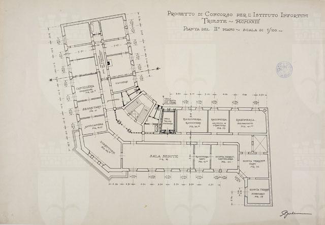 Si tratta di uno dei disegni della serie "Progetto per la costruzione della sede dell'Istituto Nazionale d'Assicurazione per gli Infortuni sul Lavoro in via Coroneo" eseguiti da Arduino Berlam, cfr. schede CMSAOAR10_4245 - CMSAOAR10_4271. Nel dicembre 1922 Arduino Berlam venne invitato a partecipare al concorso per la sede dell'Istituto Nazionale d'Assicurazione per gli Infortuni sul Lavoro, che sarebbe stata realizzata in via Coroneo a Trieste. Egli presentò la sua proposta il 14 marzo 1923, che non venne selezionata: fu preferito il progetto degli architetti Enrico e Umberto Nordio. La tavola in esame illustra la planimetria definitiva del II piano, in cui l’area dedicata agli uffici è nettamente separata a quella destinata ad abitazione per un funzionario dell’istituto. Vi è inoltre una cella-valori sussidiaria, che Berlam ipotizzava eseguita in “ferri a I, riuniti fra loro con cantonali, specialità della Ditta Antonio Parma di Saronno” (cfr. relazione allegata).