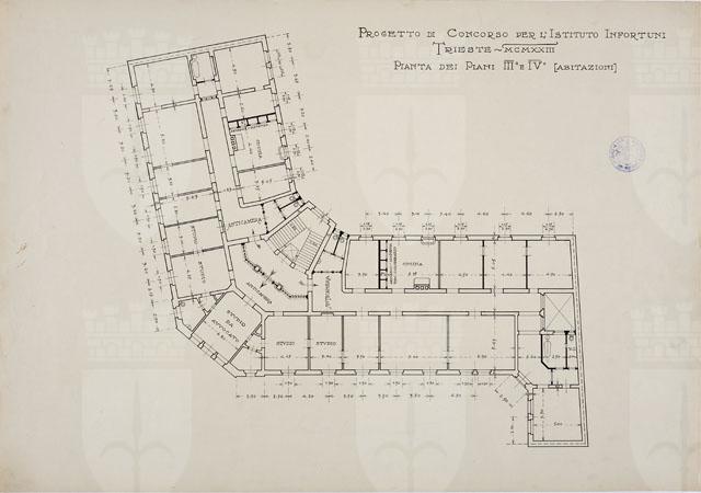 Si tratta di uno dei disegni della serie "Progetto per la costruzione della sede dell'Istituto Nazionale d'Assicurazione per gli Infortuni sul Lavoro in via Coroneo" eseguiti da Arduino Berlam, cfr. schede CMSAOAR10_4245 - CMSAOAR10_4271. Nel dicembre 1922 Arduino Berlam venne invitato a partecipare al concorso per la sede dell'Istituto Nazionale d'Assicurazione per gli Infortuni sul Lavoro, che sarebbe stata realizzata in via Coroneo a Trieste. Egli presentò la sua proposta il 14 marzo 1923, che non venne selezionata: fu preferito il progetto degli architetti Enrico e Umberto Nordio. La tavola in esame illustra la planimetria definitiva del III e IV piano. Essa non presenta modifiche sostanziali rispetto allo schizzo CMSAOAR10_4249, alla cui scheda si rimanda per ulteriori considerazioni.