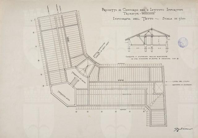 Si tratta di uno dei disegni della serie "Progetto per la costruzione della sede dell'Istituto Nazionale d'Assicurazione per gli Infortuni sul Lavoro in via Coroneo" eseguiti da Arduino Berlam, cfr. schede CMSAOAR10_4245 - CMSAOAR10_4271. Nel dicembre 1922 Arduino Berlam venne invitato a partecipare al concorso per la sede dell'Istituto Nazionale d'Assicurazione per gli Infortuni sul Lavoro, che sarebbe stata realizzata in via Coroneo a Trieste. Egli presentò la sua proposta il 14 marzo 1923, che non venne selezionata: fu preferito il progetto degli architetti Enrico e Umberto Nordio. La tavola illustra l'icnografia del tetto a falde disuguali, necessaria per avere i locali "prospicienti verso il cortile con soffitto piano" (cfr. Relazione allegata). Lo schizzo preparatorio è all'inventario CMSAOAR10_4251.