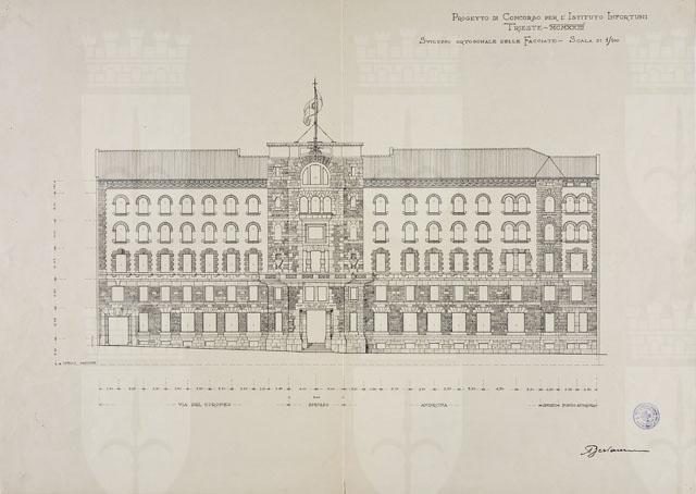 Si tratta di uno dei disegni della serie "Progetto per la costruzione della sede dell'Istituto Nazionale d'Assicurazione per gli Infortuni sul Lavoro in via Coroneo" eseguiti da Arduino Berlam, cfr. schede CMSAOAR10_4245 - CMSAOAR10_4271. Nel dicembre 1922 Berlam venne invitato a partecipare al concorso ristretto a inviti per la sede dell'Istituto Nazionale d'Assicurazione per gli Infortuni sul Lavoro, che sarebbe stata realizzata in via Coroneo. "Il bando prescriveva il perimetro dell'edificio e determinava l'esatta quadratura di ogni singolo ambiente, in base a un progetto elaborato in precedenza dal fiduciario tecnico dell'Istituto. Erano prescritte altresì l'altezza dei piani e varie altre esigenze, di modo che meglio risolveva il problema chi maggiormente s'avvicinava al progetto base" (Berlam 1923). Arduino Berlam presentò la sua proposta il 14 marzo 1923, che non venne selezionata: fu preferito il progetto degli architetti Enrico e Umberto Nordio. Il disegno in esame illustra il prospetto dell'edificio. Berlam propone un ampio uso del bugnato a blocchi rettangolari lavorati grossolanamente per ricoprire il livello sotterraneo, il piano terra e il primo piano dell’edificio, per gli smussi, oltre all’uso quali conci per inquadrare le finestre degli altri piani elevati. Nella relazione di corredo al progetto l’architetto suggerisce l’uso della pietra calcarea di Aurisina e dell’arenaria azzurognola di Muggia, “opportunamente alternate e armonizzate”. Nel disegno l’arenaria è indicata con il tratteggio, la pietra calcarea a punteggiature. I fondi di muro del secondo, terzo e quarto piano “saranno d’intonaco di malta […] trattato a cazzuola e quindi tinteggiato a calce in colore bianco-avorio per dare spicco alla pietra oscura”. Sotto la linda aveva ipotizzato un fregio a colori per “dare un po’ di brio alla facciata, che altrimenti sarebbe un po’ troppo severa” (cfr. Relazione allegata).