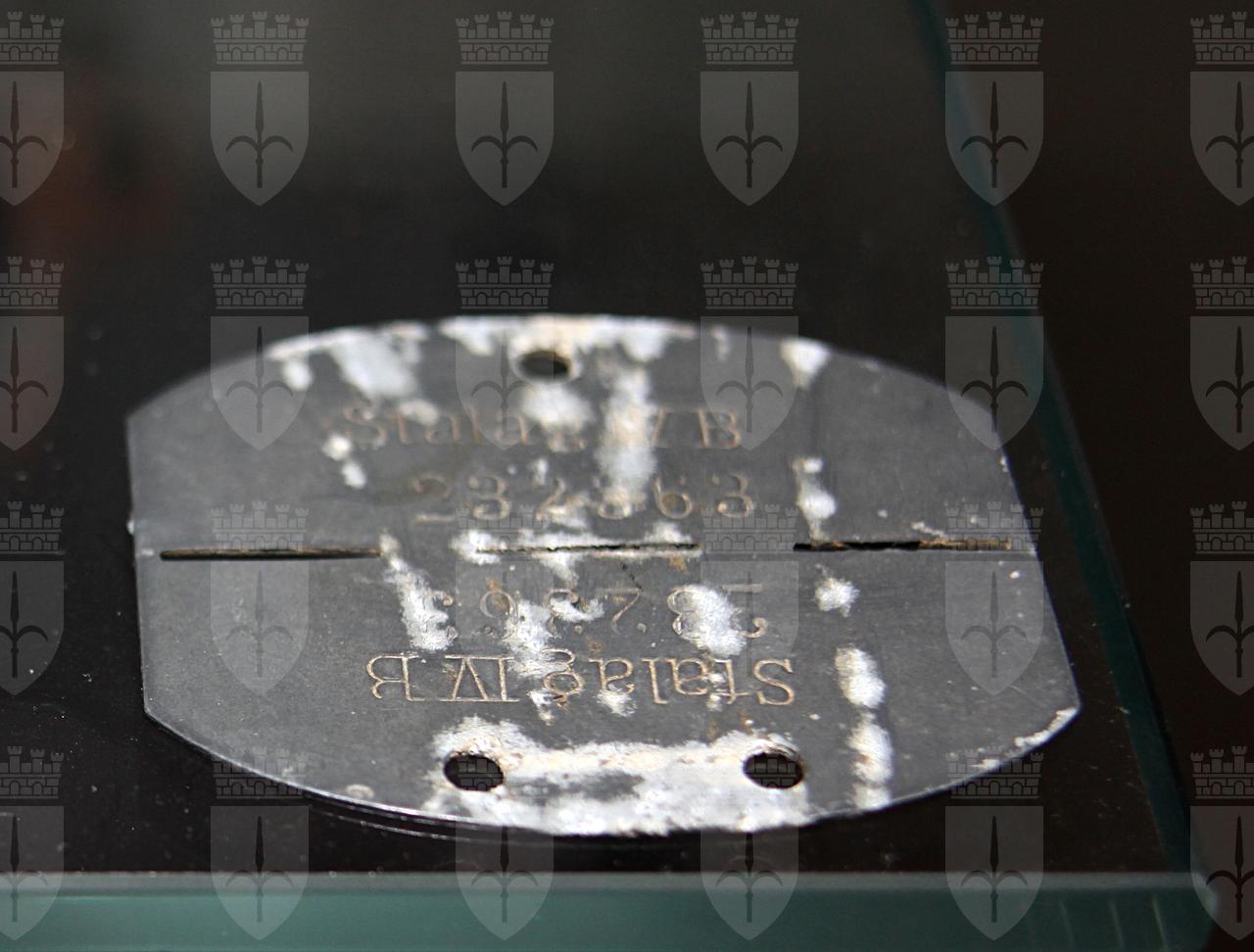 Si tratta di una piastrina di riconoscimento con numeri bulinati ripetuti a specchio nella metà della piastrina. Di forma rettangolare, ha i lati lunghi arrotondati e presenta tre fori.
