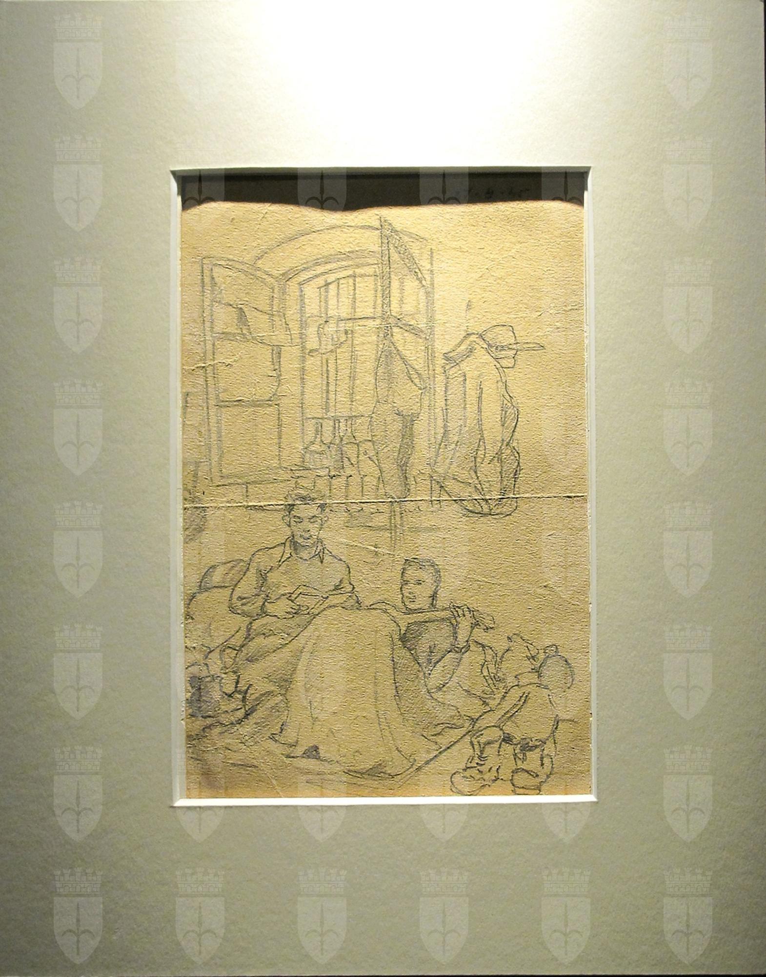 Il disegno rappresenta due figure, sedute a terra, in un interno. L'uomo sulla sinistra legge un libro, quello sulla destra suona un mandolino, ha una coperta sulle gambe. Alla loro sinistra, a terra, degli scarponi e altri oggetti. Dietro di loro, una finestra con le lastre aperte, ma chiusa con le sbarre. Sul muro, appesi, una giacca e un cappello con la piuma.