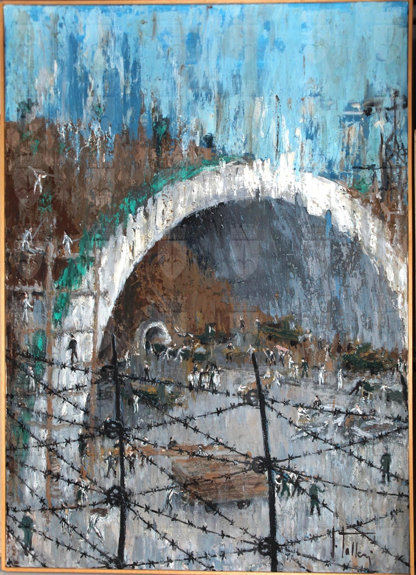 Giovanni Talleri fu prigioniero tra il 1944 e il 1945 a Mühldorf, un campo di concentramento, sottocampo di Dachau, in Germania. Ricordano questa durissima esperienza alcuni disegni, tracciati al ritorno a Trieste, e una serie di dipinti, tra cui questo in esame, che in particolare fa parte di una serie di acrilici della fine degli anni Ottanta del Novecento e raffigura i lavori di costruzione della galleria sotterranea di Mühldorf. Sul retro la tela presenta l'iscrizione “Mühldorf 1944” (in alto), “106” (al centro), ci sono poi timbro e firma dell'autore (in basso a destra).