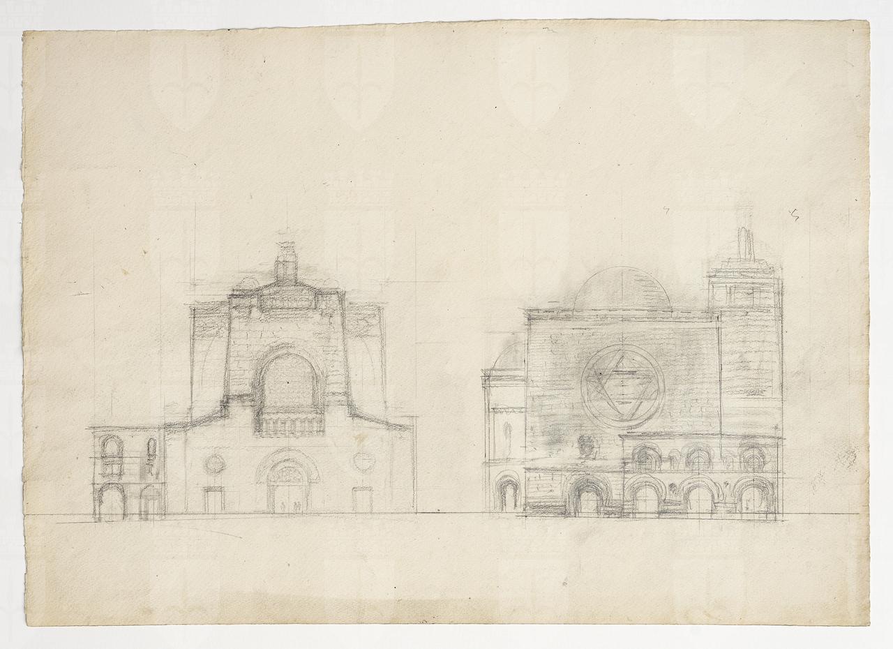 Tavola progettuale per la Sinagoga di Trieste, raffigurante la facciata principale e quella laterale.