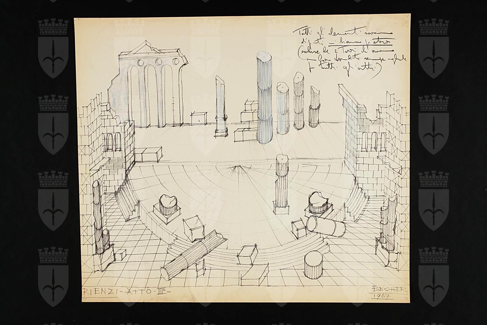Scenografia per Rienzi, l'ultimo dei tribuni di Richard Wagner, Trieste, Teatro Verdi, stagione lirica 1967-1968, regia scene e costumi di Gianrico Becher
