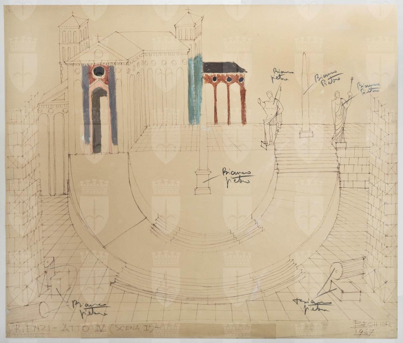 Rienzi, l'ultimo dei tribuni di Richard Wagner. Piazza romana semicircolare con scalinata, edifici ecclesiastici con obelisco e torri, statue virili.